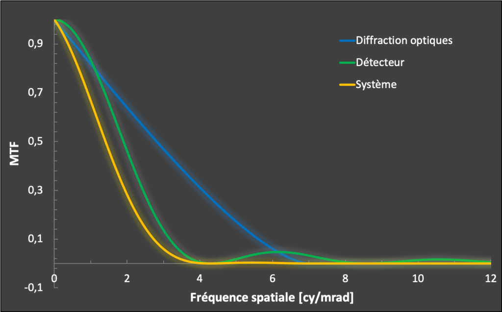 Il est possible de comparer ensuite les courbes expérimentales aux théoriques. Par exemple, sur le graphique ci-dessous, on observe les courbes MTF théoriques d’un système, de son optique et du détecteur. Il est alors aisé de superposer la mesure MTF expérimentale et de la comparer avec la courbe jaune. On pourra ainsi juger de la qualité du système en fonction de ses paramètres intrinsèques.
